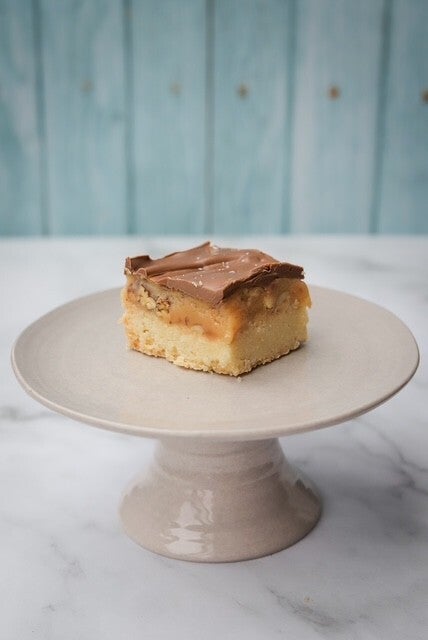Een koekjesbodem, smeuïge caramel met noten en afgewerkt met chocolade